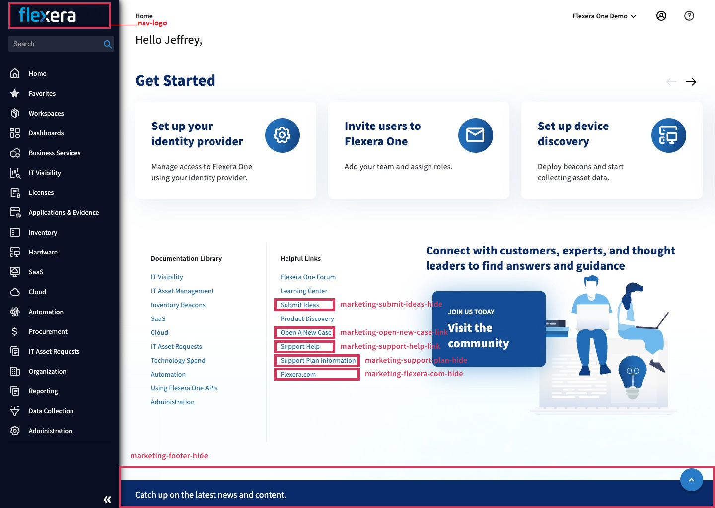 marketing-flexera-com-hideBoolA boolean to determine show/hide of the Flexera\.com link on the landing page. For visual reference of this item’s location, see Landing Page.True —Item is hidden. False—Item is visible.