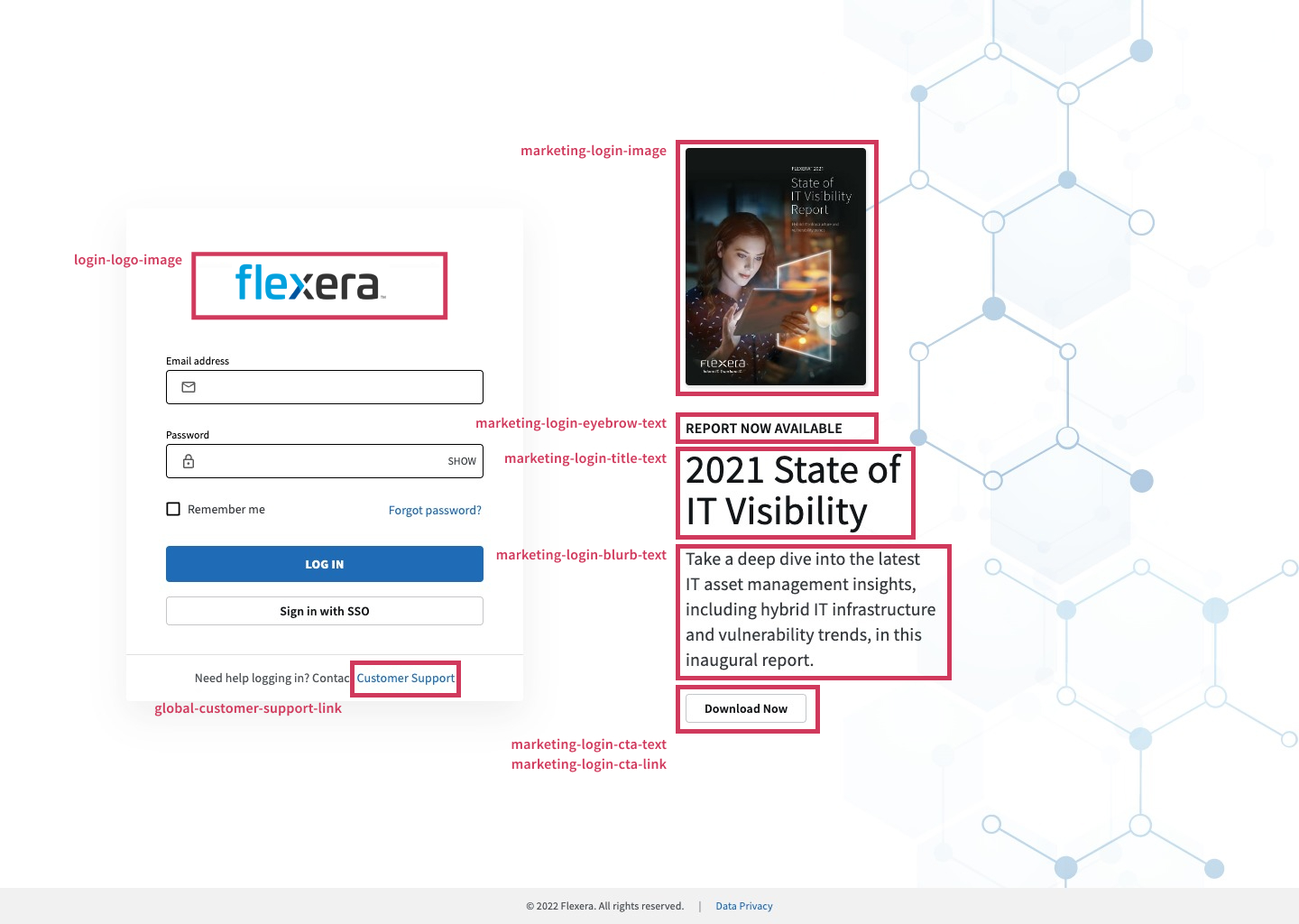marketing-login-imageURLThe web address of the image resource file location to use in place of the Flexera marketing section on the login page. For visual reference of this item’s location, see Login Page.Recommended pixel size—At most 300 horizontal pixels. At most 300 vertical pixels. Recommended style—Any. Recommended format—Any. A slight corner radius and drop shadow are applied to this image with CSS.