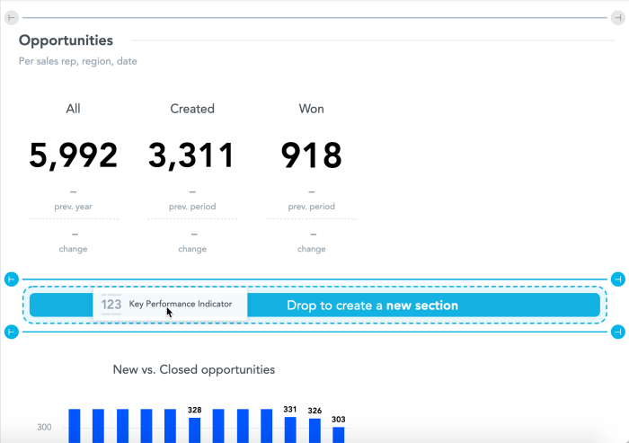 2. The row height is automatically adjusted to the height of the highest widget in the row. For example, if you have a headline widget and add a column chart, the height of the headline adjusts to the height of the column chart.