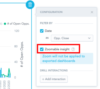 If your insights have too much information and are unreadable, you can zoom into details. First, you must edit the dashboard to enable zooming for individual insights, then you can zoom insights when viewing the dashboard.